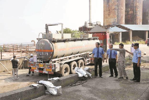 嘉鱼县检察院检察官与相关行政单位工作人员现场监督危化品转移。