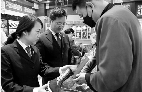 北京市西城区检察院检察官走访老字号企业内联升,了解企业专利权保护情况。 本报记者程丁摄