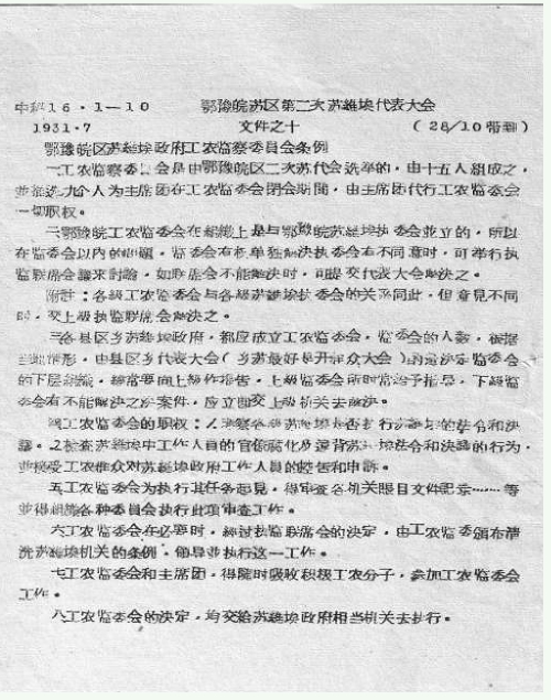 鄂豫皖苏区第二次苏维埃代表大会颁布的《鄂豫皖区苏维埃政府工农监察委员会条例》