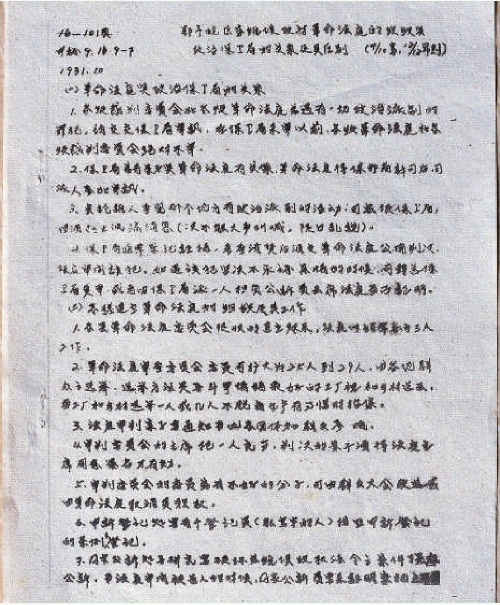 鄂豫皖革命根据地制定的《鄂豫皖区苏维埃政府革命法庭的组织与政治保卫局的关系及其区别》 (图片提供:大别山人民检察博物馆)
