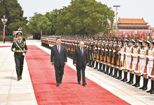 5月16日上午,国家主席习近平在北京人民大会堂同来华进行国事访问的俄罗斯总统普京举行会谈。这是会谈前,习近平在人民大会堂东门外广场为普京举行隆重欢迎仪式。 新华社记者饶爱民摄