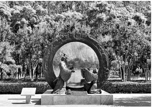 “运河清风”廉政文化主题公园中的雕塑“甘棠镜鉴”。