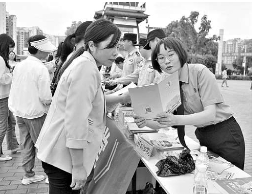 检察干警向群众发放普法手册并解答涉法问题。