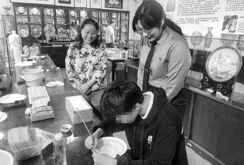2024年4月,在广州广彩工作室,罪错未成年人在非遗传承人带领下,认真学习广彩技艺。
