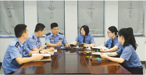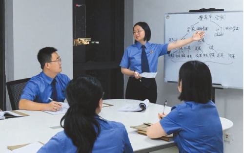 鼓楼区检察院检察官与侦查人员共同分析案情。