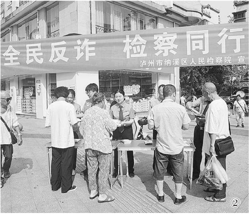 图②:四川省泸州市纳溪区检察院干警来到文化广场,现场向居民讲解如何防范刷单返利、虚假投资理财、冒充熟人诈骗等行为。 本报通讯员周茜摄