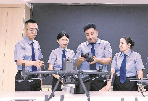 新疆维吾尔自治区检察院喀什分院公益诉讼检察团队成员学习如何操作无人机。