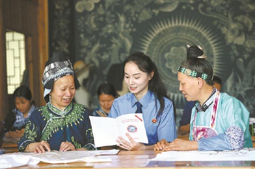 近日,贵州省丹寨县检察院检察官来到该县龙泉镇卡拉村非遗文创基地,向苗族蜡染非遗手工艺人宣传讲解非物质文化遗产保护相关法律知识。