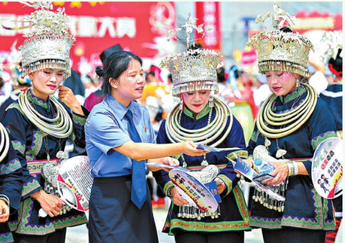 日前,贵州省锦屏县检察院检察官来到该县民俗文化活动现场,向参演者和群众宣传非物质文化遗产传承和保护相关法律知识,提升群众的法治意识和维权能力,为营造平安、和谐锦屏贡献检察力量。