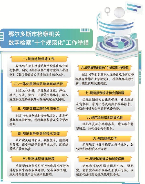 “数字检察规范化建设不仅包括在数据获取、使用方面的规范化,也包括模型上架、推广中的规范化,更有组织方面的规范化,十项规范化建设内容既环环相扣,又相互补强。”鄂尔多斯市检察院党组副书记、副检察长尹桂君介绍。