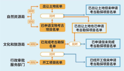 第二步,将“已出让土地也已申请考古勘探”项目名单数据与文旅部门已完成考古勘探名单进行碰撞,从中发现“已申请但未完成考古勘探”项目名单。