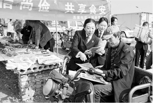 10月14日,辽宁省沈阳市苏家屯区检察院干警来到辖区新开河大集,通过悬挂条幅、发放宣传单、走访附近村民、开展现场答疑等方式,在与村民及商贩“唠家常”的过程中,介绍食品安全相关法律法规,让法律知识从“纸间”进入群众“心间”。