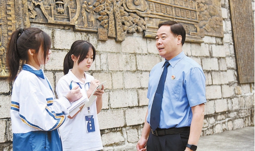 4月25日,广东省汕头市检察院党组书记、检察长彭章波(右一)接受校园小记者采访。