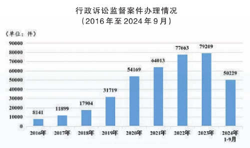 报告显示,2018年12月,最高检设立行政检察厅专司行政检察职责,31个省区市检察院和有条件的地市级检察院逐步单设行政检察机构。2019年至2023年,全国检察机关共办理行政检察监督案件47.9万件,是前五年的2.6倍。今年1月至9月共办理行政检察监督案件15.9万件,其中行政诉讼监督案件5万件、行政违法行为监督案件1.4万件、行政执法和刑事司法反向衔接案件9.5万件。