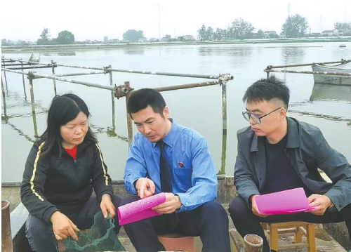 近日,江苏省金湖县检察院检察干警来到金湖县塔集镇新华村开展普法宣传活动。图为检察干警走进鱼塘为养殖户开展预防诈骗宣传。 顾善俊/摄