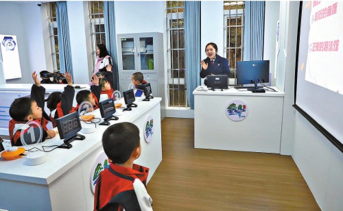 近日,贵州省六盘水市钟山区检察院邀请区第三实验幼儿园部分小朋友,到该院“钟之航”信息化办案暨青少年法治教育中心,进行沉浸式法治体验。孩子们通过观看法治动画片、法治VR体验等方式,树立了法治意识、增强了自我保护能力。图为检察官将法律知识编成简短的小故事,一边讲述故事一边提问,组织小朋友们举行抢答比赛,并为大家解释答案。