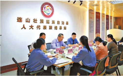 今年4月,广东省连山壮族瑶族自治县检察院干警与该县人大代表围绕深化双向衔接转化工作进行沟通交流。 何璧余/摄