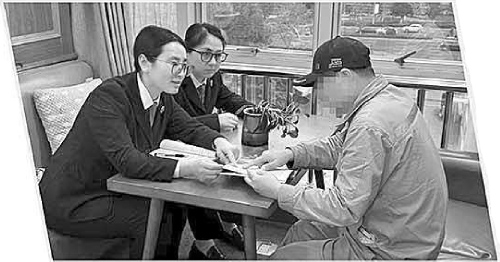宁波市奉化区检察院检察官向当事人老吴宣讲残疾人帮扶政策并释法说理。
