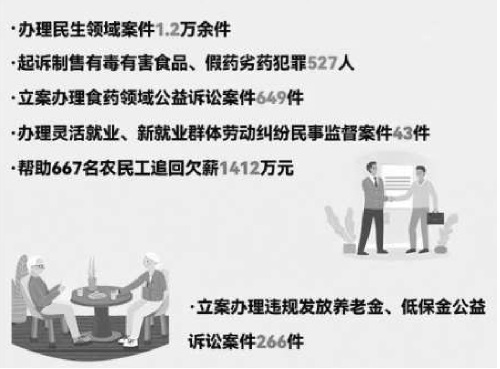 2024年,甘肃省检察机关精准对接食药、就业、社保、特定群体权益保护,办理民生领域案件1.2万余件。守护群众生命健康,起诉制售有毒有害食品、假药劣药犯罪527人,立案办理食药领域公益诉讼案件649件。守护劳动者合法权益,办理快递配送、平台经济等灵活就业、新就业群体劳动纠纷民事监督案件43件,促进解决工伤认定、社保缴纳等方面问题,积极参与欠薪治理,帮助667名农民工追回欠薪1412万元。守护特定群体合法权益,立案办理违规发放养老金、低保金公益诉讼案件266件;支持权益受损但无力起诉的特定群体提起民事诉讼1540件,对598名生活困难的被害人开展司法救助。守护未成年人健康成长,起诉侵害未成年人犯罪1144人,对严重犯罪的未成年人起诉851人,督促对81名未履行侵害未成年人强制报告义务的人员予以追责。