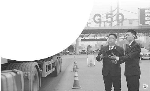 图②:2024年3月,重庆市江北区检察院检察官在高速公路出入口了解物流车辆缴费情况。