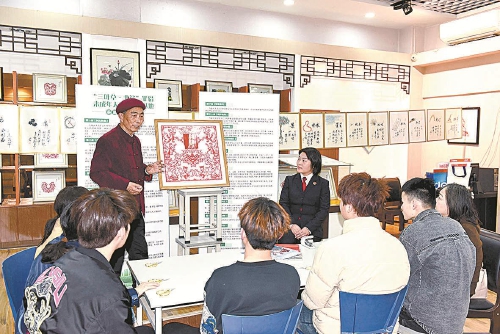 3月24日,江苏省淮安市金湖县检察院依托“三叶草·非遗”罪错未成年人观护帮教基地,邀请省级非遗文化项目“金湖剪纸”传承人陆功勋,为罪错未成年人开展非遗技能培训。图为陆功勋将传统文化与法治教育有机融合,围绕宪法剪纸图,讲解宪法的含义,引导罪错未成年人尊法、守法。