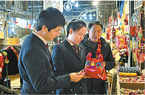 近日,陕西省陇县检察院检察官来到该县非物质文化遗产展览馆,向游客宣传公益诉讼检察职能,并与展览馆负责人、陇县民间艺术家协会主席、陇州社火疙瘩脸绘制技艺市级项目代表性传承人杨秉权深入交流,了解相关问题线索。
