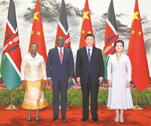 四月二十四日上午,国家主席习近平在北京人民大会堂同来华进行国事访问的肯尼亚总统鲁托举行会谈。这是习近平和夫人彭丽媛同鲁托和夫人蕾切尔合影。 新华社记者李学仁摄