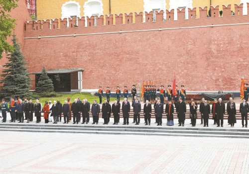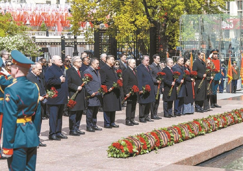 当地时间5月9日,俄罗斯举行盛大庆典,纪念苏联伟大卫国战争胜利80周年。国家主席习近平和来自世界20多个国家及国际组织领导人应邀出席庆典。庆典结束后,习近平同其他国家领导人一起从红场来到亚历山大花园,向无名烈士墓献花,并肃立默哀。 新华社记者翟健岚摄