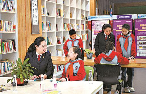 2025年3月,重庆市检察机关未检检察官走进中心城区的中学开展送法进校园活动,为学生们带来法治大餐。图为检察官在图书馆与孩子们交流谈心。