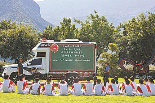 2023年6月,重庆市委办公厅、市政府办公厅联合发文,将“莎姐”检察工作品牌升级为全市未成年人保护和犯罪预防工作品牌。重庆市委政法委牵头,在全市范围内部署开展“莎姐守未”专项行动。图为重庆市巫山县检察院在当地中学开展“莎姐守未”专项行动。