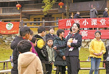 重庆市检察院未检检察官走进苗寨,为村里的家长、留守儿童开展院坝普法。图为检察官与孩子们互动交流。