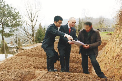 今年3月17日,重庆市云阳县检察院检察官为当事人现场指明争议土地新的边界划分示意图。