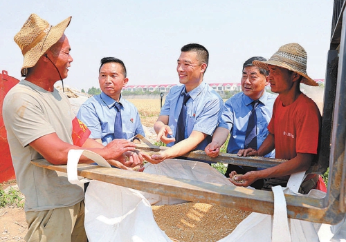 正值麦收时节,连日来,河南省许昌市检察机关驻村检察干警深入田间查看麦收情况,并就耕地保护、农机安全、禁烧防火、防范诈骗等为群众提供法治服务,用实际行动护航“三夏”(夏收、夏种、夏管)生产,确保夏粮颗粒归仓。图为检察干警在听取群众意见、解答群众困惑。