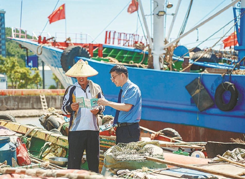 近日,浙江省舟山市普陀区检察院检察官来到沈家门渔港码头,开展禁渔期法治宣传。检察官通过面对面案例讲解等方式,向渔民详细解读禁渔期相关政策法规,呼吁他们不要以“渔网”触“法网”。