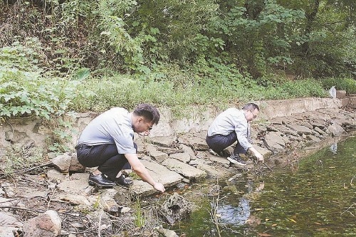 江苏省南京市浦口区检察院干警在老山国家森林公园内调查外来入侵物种福寿螺的生长情况。