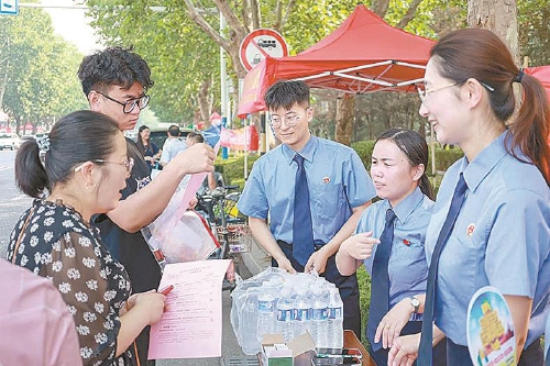 连日来,山东省沂南县检察院为预防涉考生家庭诈骗案件发生,进学校、到社区、上街头,开展系列普法宣传活动。图为检察官来到辖区学校附近,向过往学生家长发放反诈宣传单,提醒他们防范“招生陷阱”“暑期刷单返利”等骗局。