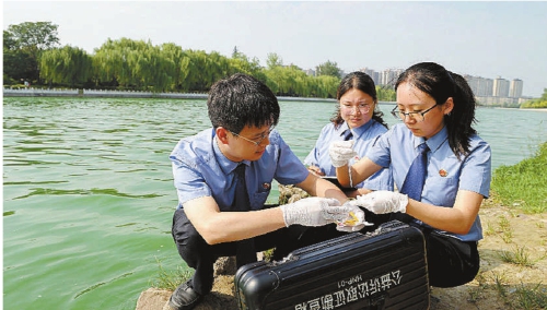 近日,在河南省郑州市熊儿河畔,河南自由贸易试验区郑州片区检察院公益诉讼办案组检察官手持水质检测仪采集水样。据悉,2019年至今,该院已受理涉黄河流域生态环境类公益诉讼线索14件,立案调查12件,制发检察建议12份,成功督促退养鱼塘483个,退养面积达6428亩,督促整改拆除违法建筑7.7万余平方米。