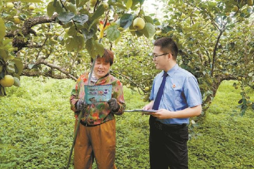 2025年7月,砀山县检察院干警深入梨园,将防诈知识手册送到果农手中。 冯康莉/摄