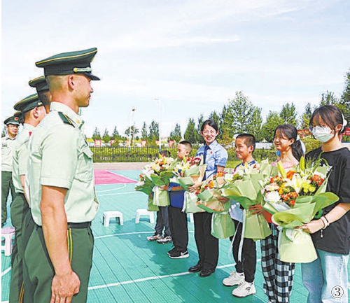 图③:近日,内蒙古自治区武川县检察院邀请学生代表开展“萌娃进军营”爱国主义教育活动。孩子们参观了军营并将鲜花献给“最可爱的人”。 本报记者沈静芳 通讯员贾俣乐 张琪珧摄