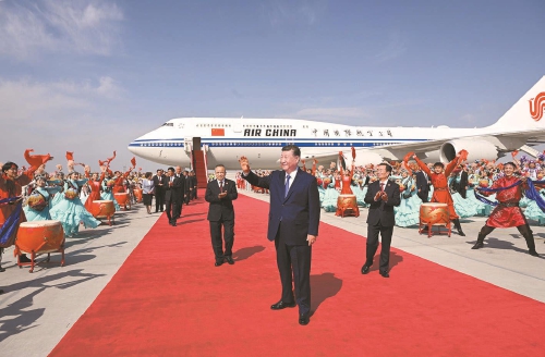 新疆维吾尔自治区党委书记陈小江、自治区人民政府主席艾尔肯·吐尼亚孜、自治区人大常委会主任祖木热提·吾布力、自治区政协主席努尔兰·阿不都满金、新疆生产建设兵团政委何忠友等在舷梯下迎候。习近平走下舷梯时,少先队员献上鲜花。各族群众代表身着民族服饰,载歌载舞,欢迎总书记的到来,表达对总书记的衷心祝福。
