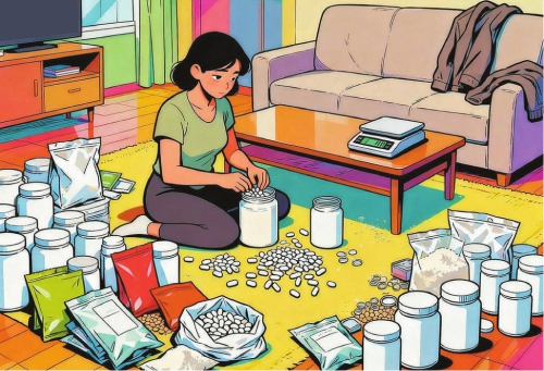 ◆客厅内,无任何标签的白色粉末、散装的减肥茶包、豆浆粉、奇亚籽、木糖醇、荷叶粉、菊粉等原料与大量空白罐子、包装袋、胶囊壳杂乱地堆放在一起,一台热压封口机竟是唯一的“生产设备”。