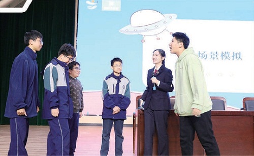 浙江省湖州市南浔区检察院检察官在双林二中开展场景模拟普法。
