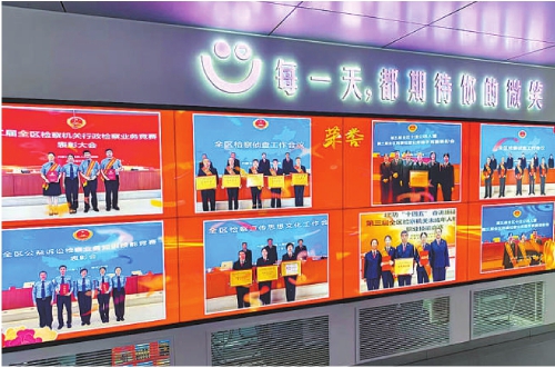 我是这面笑脸墙的设计者和制作参与者之一。这一灵感的最初来源,是我院刑事检察部门斩获全区检察业务竞赛奖项后的留影。那次竞赛竞争激烈,我院几位参赛选手不惧挑战,凭借扎实的专业知识积累和临危不乱的底气赢得了奖杯。载誉归来后,院里专门为他们举办了庆祝仪式,每个人的脸上都洋溢着胜利的喜悦,我们站在一旁,用镜头定格下了他们笑颜如花的模样。院党组书记、检察长陈雪梅看着照片说:“这么具有历史意义的照片,应该放到大家都能看得到的地方,大家都要学习他们拼搏向上的精神。”检察长的一句话点醒了我,我当即建议:“我们可以做一面笑脸墙,让大家每天都能看到同事们的笑容!”这个提议获得了大力支持,于是,一面巨大的电子笑脸墙就诞生了。