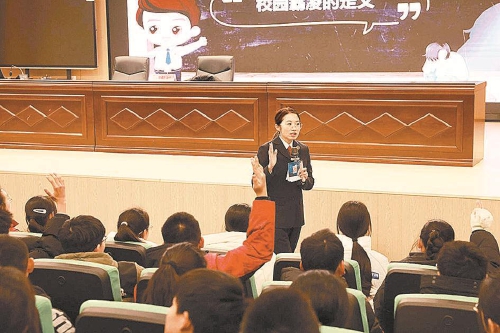 近日,江苏省扬州市邗江区检察院未检团队检察官走进中学,讲授预防校园欺凌法治课,并介绍该院编著的《成语里的法律智慧》普法书。