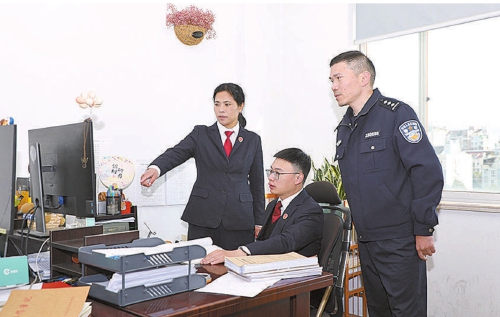 2025年4月,浙江省永嘉县检察院检察官吕赛燕(左)与同事对一起合同纠纷案进行审查。