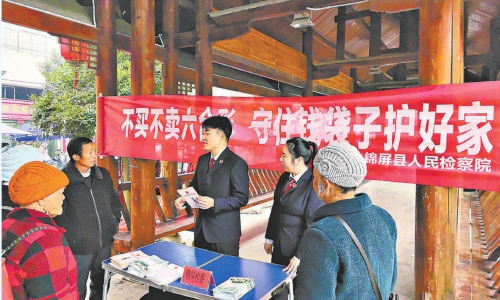 近日,贵州省锦屏县检察院干警走进辖区农村赶集日现场,开展“禁止买卖六合彩”主题法治宣传。检察干警向过往群众发放宣传手册,用本地方言介绍办理的涉“六合彩”赌博典型案例,揭示此类行为的严重危害。