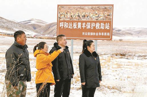 1月14日,王丽君(左二)和内蒙古自治区科尔沁右翼前旗检察院检察官再次来到草原深处的黄羊保护救助站,向受聘在这里工作的牧民了解黄羊过冬情况。