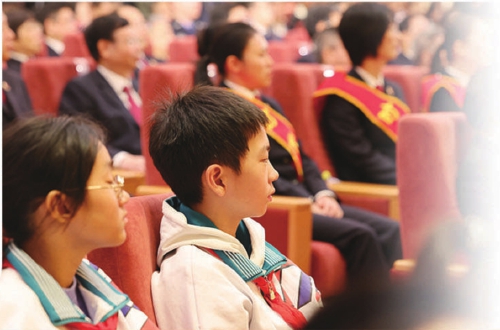 2025年11月10日,“时代楷模”重庆检察未成年人保护工作团队代表先进事迹报告会在人民大会堂举行。图为北京景山学校学生代表参加报告会。