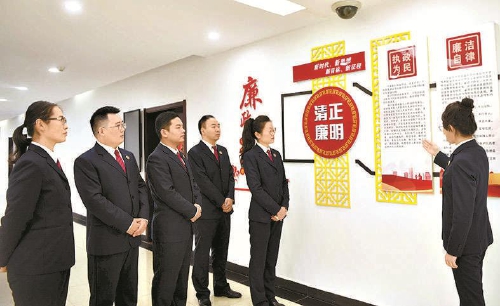 “从古今清廉典范到身边干警廉洁履职事迹,每一段文字每一张照片都浸润着守正信念,让廉洁从检实现具象化、可视化。”不久前,新进青年干警参观了该院“守正持衡”文化展厅后,对文化润心、廉洁铸魂深有触动。该院一手打造特色“软”活动,一手抓实阵地“硬”建设,在文化展厅中深度融入清廉检察元素,推动清廉标语上屏、清廉知识入册、清廉制度上墙,构建起“政治文化引领人,清廉文化熏陶人”的廉洁文化体系。