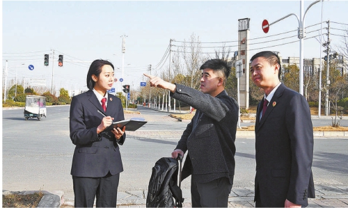 2月4日,河南省郑州市管城回族区检察院检察官在某路段路口向路人了解交通信号灯整改情况。